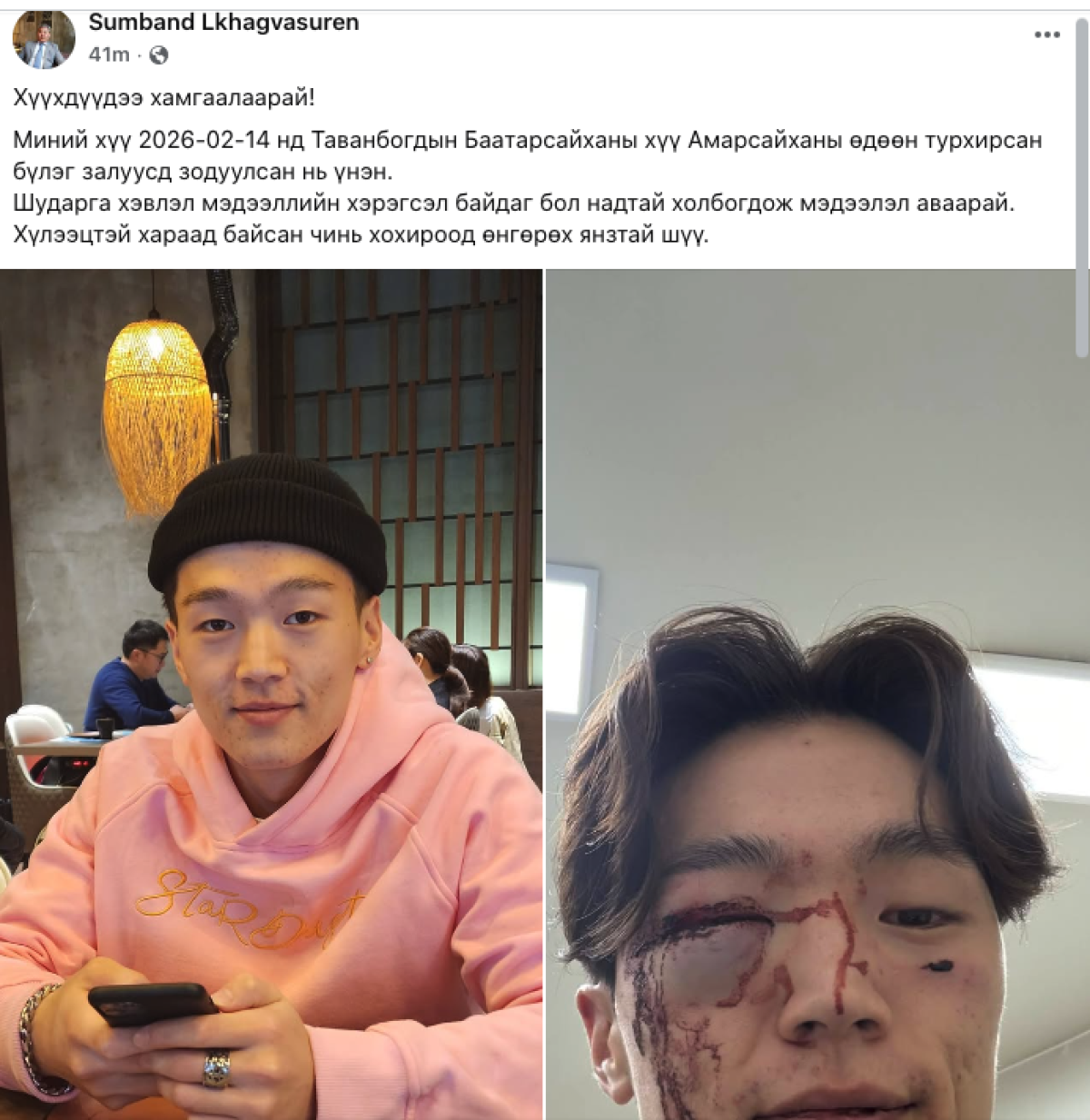 Тэрбээр "Хүүхдүүдээ хамгаалаарай! Миний хүү 2026.02.14-нд "Таванбогд"-ын Ц.Баатарсайханы хүү Б.Амарсайханы өдөөн турхирсан бүлэг залуусд зодуулсан нь үнэн. Шударга хэвлэл мэдээллийн хэрэгсэл байдаг бол надтай холбогдож мэдээлэл аваарай. Хүлээцтэй хараад байсан чинь хохироод өнгөрөх янзтай" гэв.