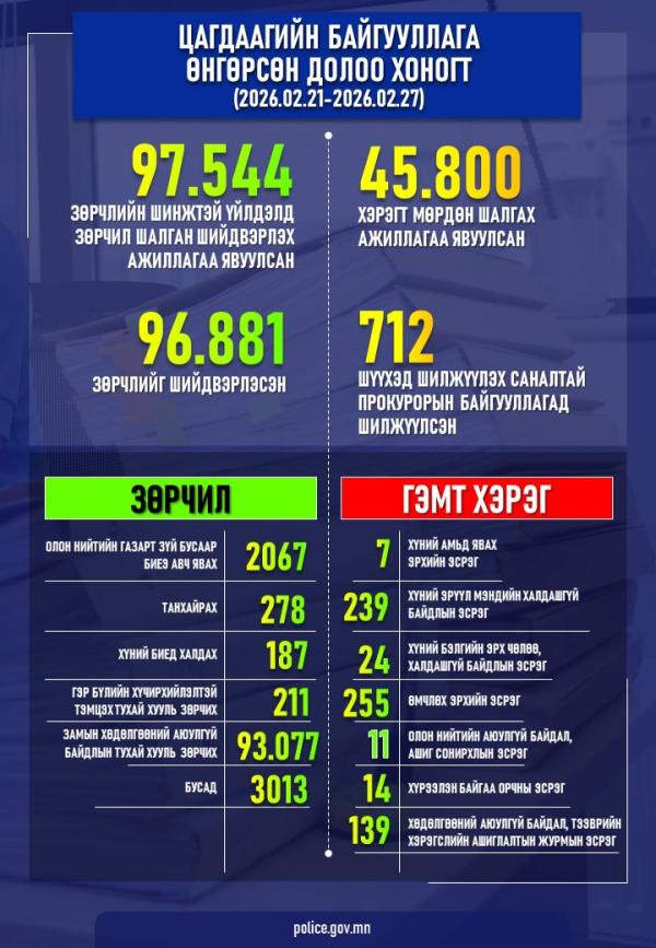 Цагдаагийн байгууллага өнгөрсөн 7 хоногт (2026 оны 02 дугаар сарын 21-ний өдрөөс 2026 оны 02 дугаар сарын 27-ны өдрүүдэд) 712 хэргийг “Шүүхэд шилжүүлэх саналтай” Прокурорын байгууллагад хүргүүлсэн. Үүнээс: