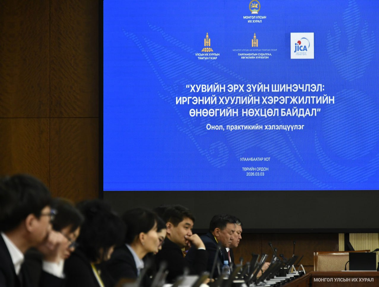 Иргэний хуулийн хэрэгжилтийн өнөөгийн бодит нөхцөл байдалд хийсэн дүн шинжилгээний тайланг хэлэлцэж, цаашид хууль тогтоомжийг боловсронгуй болгох бодлогын үндэслэл боловсруулах, олон улсын туршлагыг харьцуулан судлах (Японы туршлага), судлаач, шүүгч, хуульчдын нэгдсэн санал, дүгнэлтийг авах “Хувийн эрх зүйн зохион байгуулагдах шинэчлэл: Иргэний хуулийн хэрэгжилтийн өнөөгийн нөхцөл байдал” хэлэлцүүлэг өнөөдөр (2026.03.03) Төрийн ордонд болж байна.