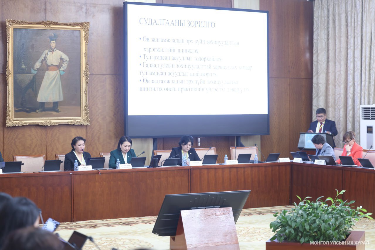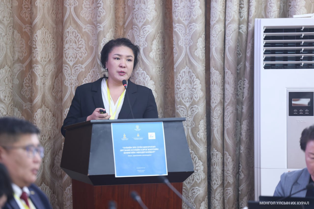 Дараа нь “Монгол Улсын Иргэний хууль дахь өв залгамжлалын эрх зүйн зохицуулалтыг шинэчлэх хэрэгцээ, шаардлага” сэдвээр Монгол Улсын их сургуулийн Хууль зүйн сургуулийн дэд профессор, (Ph.D) Б.Улаанбаатар илтгэл танилцуулав.