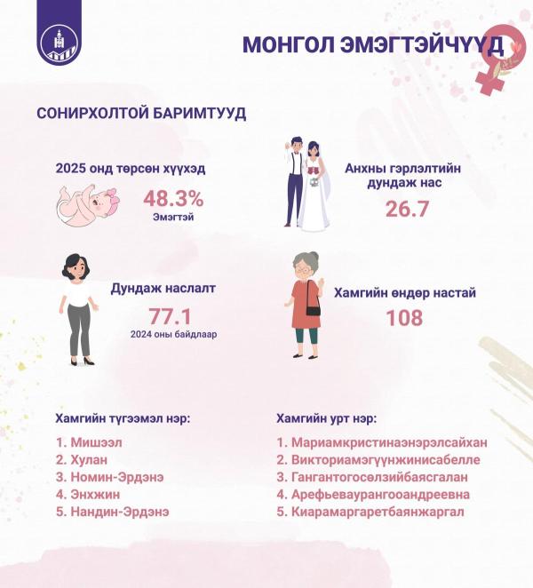 2025 онд төрсөн нийт хүүхдийн 48.3 хувь нь эмэгтэй. Улсын хэмжээнд хамгийн өндөр настай эмэгтэй 108 настай ахмад байна.