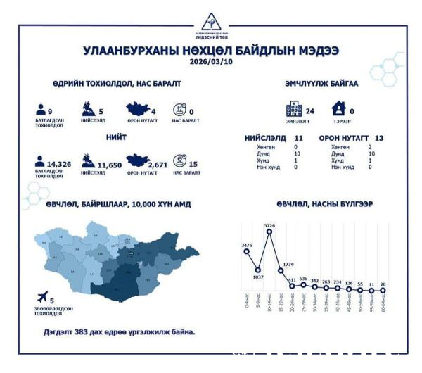 Улаанбурхан өвчний батлагдсан тохиолдол улсын хэмжээнд 14.326 хүрээд байгаа бөгөөд нийслэлд 11650, орон нутагт 2674 бүртгэгдсэн байна. 2026 оны гуравдугаар сарын 10-ны байдлаар улаанбурхан өвчний батлагдсан тохиолдол 9 нэмэгджээ.