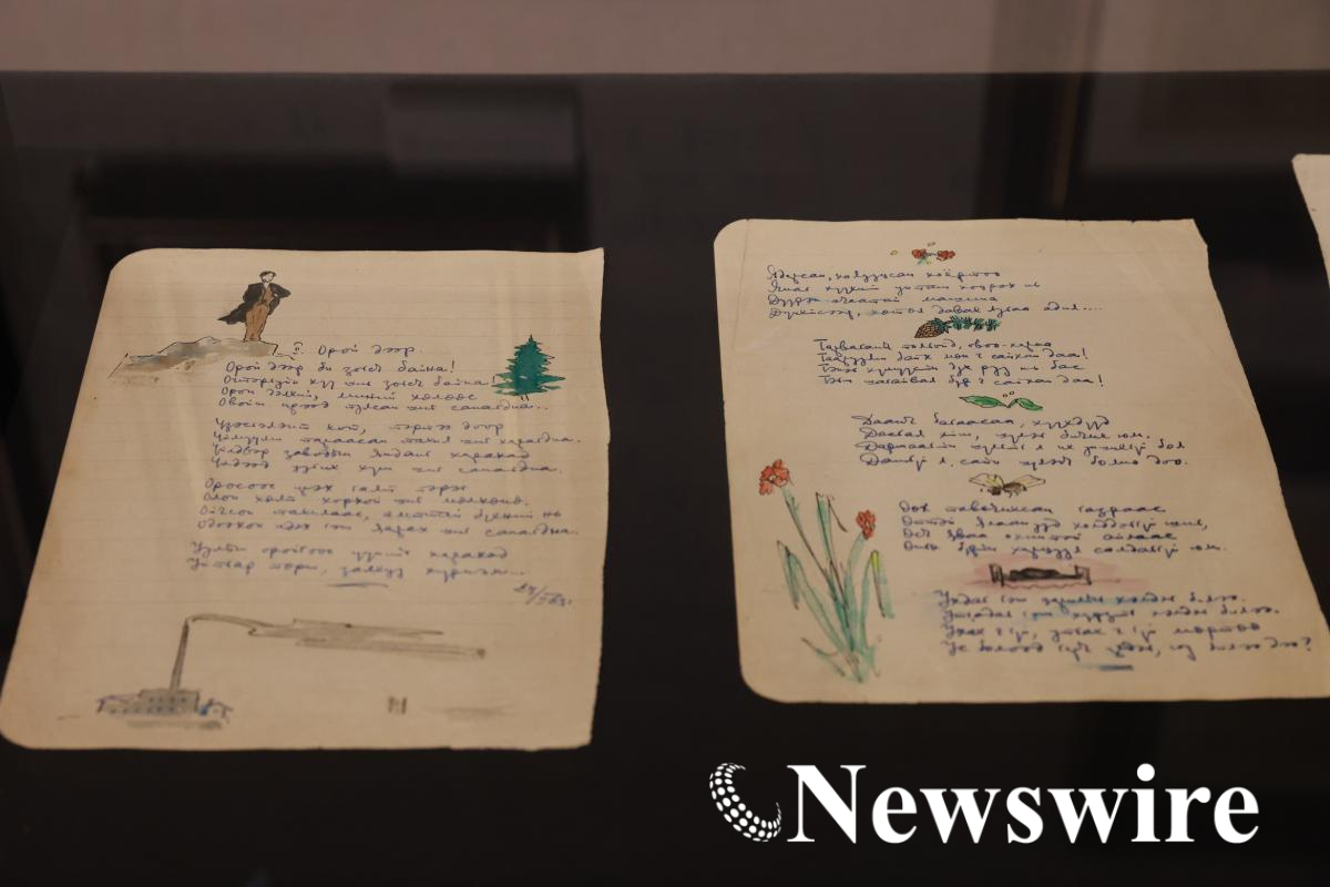 Тус үзэсгэлэнд түүний яруу найргийн бүтээлийн гар бичмэл, уран зургууд, эдэлж хэрэглэж байсан эд өлөг, амьдрал, үйл ажиллагаанд нь холбогдох түүхэн гэрэл зургуудыг дэглэн толилуулж байна.