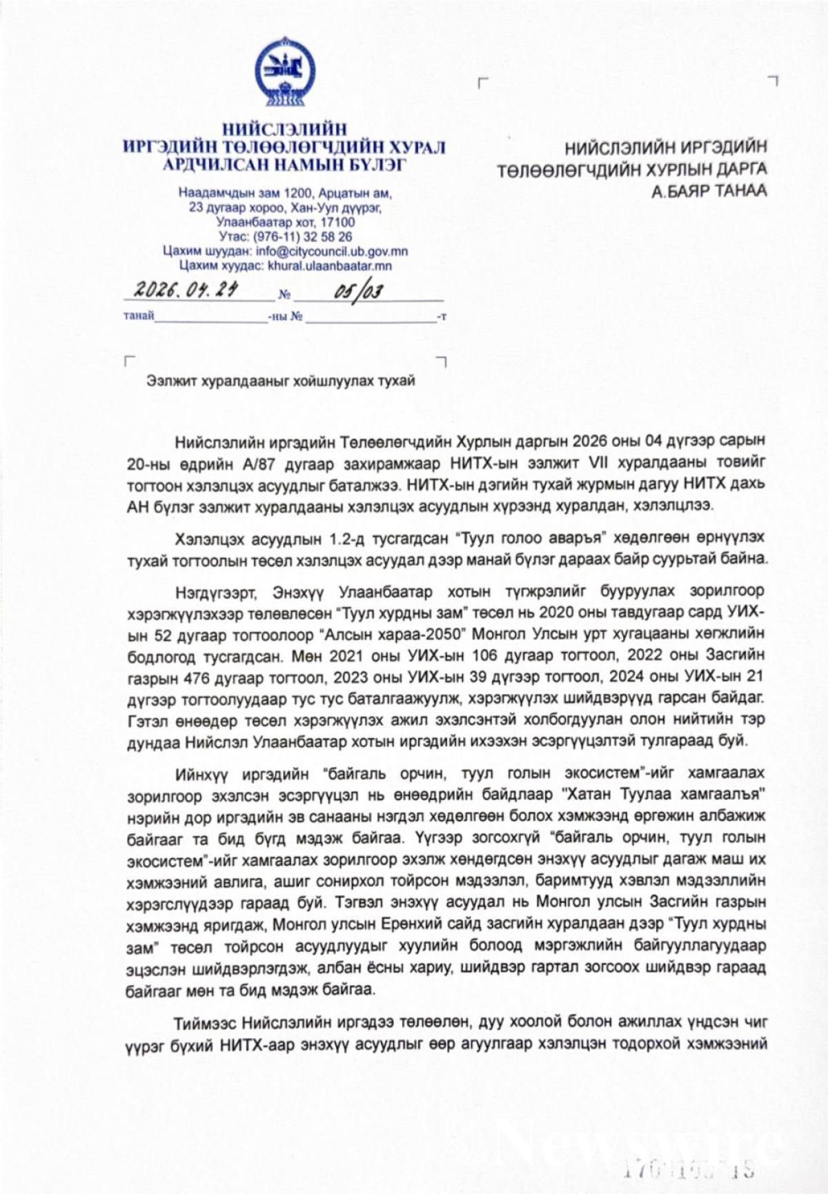 Тэрбээр “НИТХ-ын Зөвлөлийн 2026 оны 4-р сарын 20-ны хуралдаанаар ээлжит хуралдааны товыг зарласан. Өнөөдөр НИТХ дахь Ардчилсан намын бүлгээс албан бичгээр санал ирсэн. Үүнийг үндэслэн НИТХ-ын даргын хуралдааныг хойшлуулах захирамж гарсан. Ардчилсан намын бүлгээс НИТХ-ын ээлжит VII хуралдаанаар хэлэлцүүлэх асуудал нь иргэдийн эсэргүүцэлтэй тулгараад зогсохгүй, авлига, албан тушаал, ашиг сонирхол тойрсон эргэлзээ бүхий мэдээллүүд хэвлэл мэдээллээр гарч байгаагаас гадна Монгол Улсын ерөнхий сайд Засгийн газрын хуралдаанаар хуулийн болоод мэргэжлийн байгууллагуудаар шийдэх хүртэл зогсоох шийдвэрийг гаргасантай холбогдуулан хуралдаанаар хэлэлцэхээс татгалзаж хойшлуулах шаардлага ирүүлсэн тул 2026 оны 4-р сарын 27-ны өдрийн 10:00 цагт товлосон ээлжит VII хуралдааныг хойшлуулсугай гэсэн захирамж гарсан. НИТХ-ын төлөөлөгчдийг мэдээллээр хангах, хуралдааны товыг дахин тогтоох, тус захирамжийн хэрэгжилтэд хяналт тавьж ажиллах чиглэлээр НИТХ-ын Ажлын албаны дарга бөгөөд Нарийн бичгийн дарга надад үүрэг өгсөн. Үүргийн дагуу төлөөлөгчдөд хурлын тов хойшилсон талаар мэдээлэл өгөөд сууж байна” гэлээ.