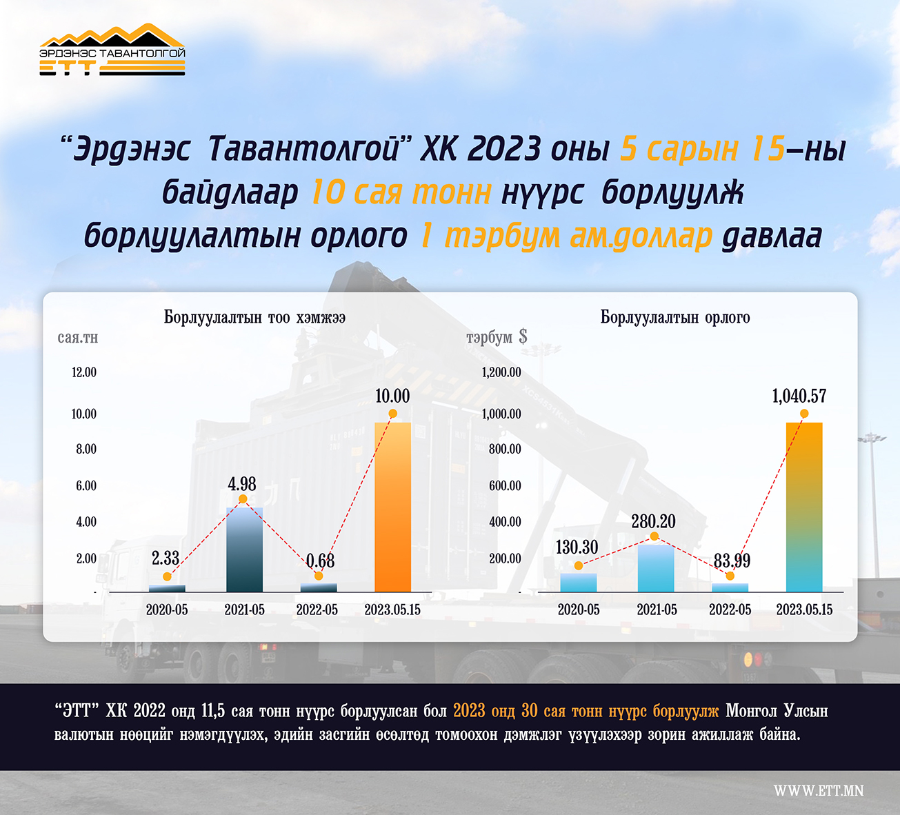Тус компани 2022 онд 11.5 сая тонн нүүрс борлуулсан бол 2023 онд 30 сая тонн нүүрс борлуулж Монгол Улсын валютын нөөцийг нэмэгдүүлэх, эдийн засгийн өсөлтөд томоохон дэмжлэг үзүүлэхээр зорин ажиллаж байна.