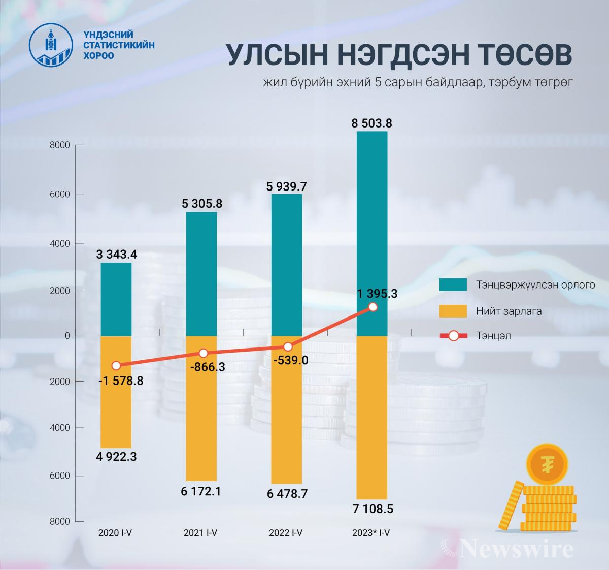 Харин тэнцвэржүүлсэн орлого 8.5 их наяд төгрөг болж, өмнөх оны мөн үеэс 2.6 их наяд төгрөг буюу 43.2 хувиар өссөн байна. Улсын нэгдсэн төсвийн нийт зарлага, эргэж төлөгдөх цэвэр зээлийн нийт хэмжээ 7.1 их наяд төгрөг болж, тэнцвэржүүлсэн тэнцэл 1.4 их наяд төгрөгийн ашигтай гарлаа.