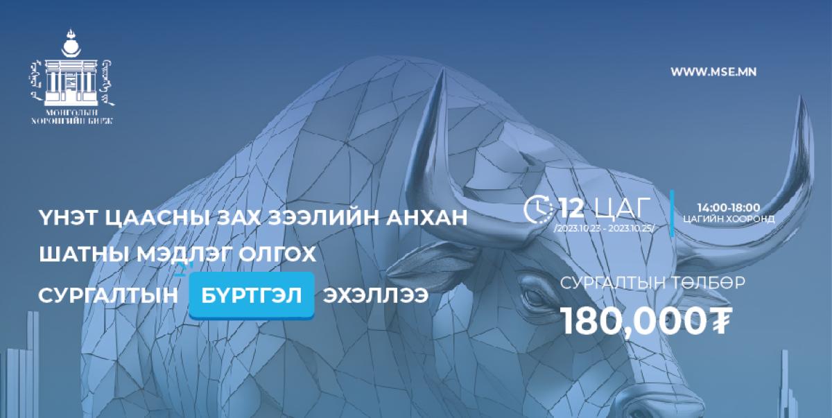 “Монголын Хөрөнгийн бирж” ХК-иас зохион байгуулдаг “Үнэт цаасны зах зээлийн анхан шатны мэдлэг олгох сургалт” 2023 оны 10 дугаар сарын 23, 24, 25-ны өдрүүдэд 14:00-18:00 цагийн хооронд Монголын хөрөнгийн биржийн сургалтын танхимд зохион байгуулагдана.