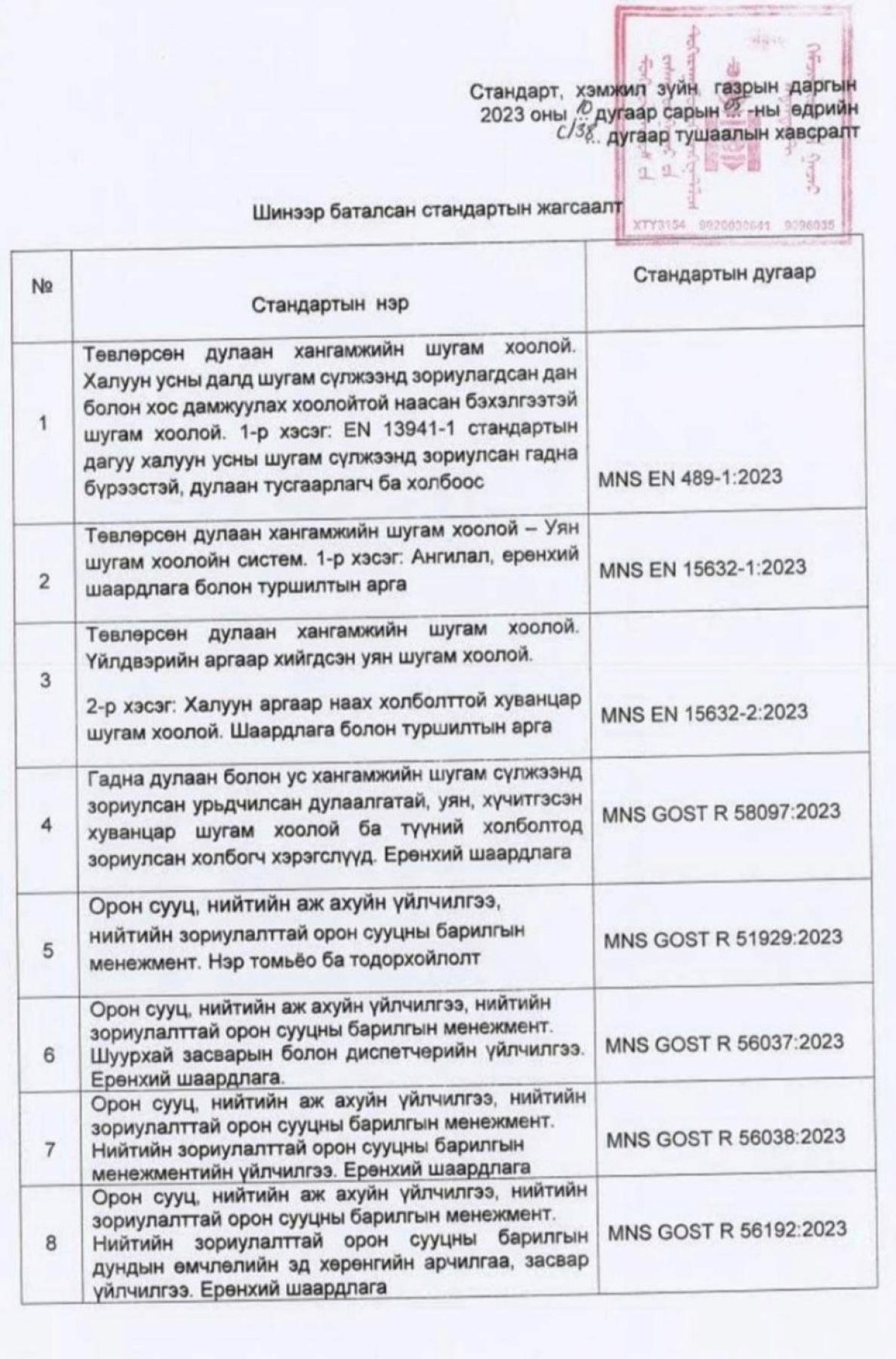 - “Нийтийн зориулалттай орон сууцны барилгын менежментийн үйлчилгээ”. Ерөнхий шаардлага /MNS GOST R 56038:2023/, “Орон сууц, нийтийн аж ахуйн үйлчилгээ, нийтийн зориулалттай орон сууцны барилгын менежмент.