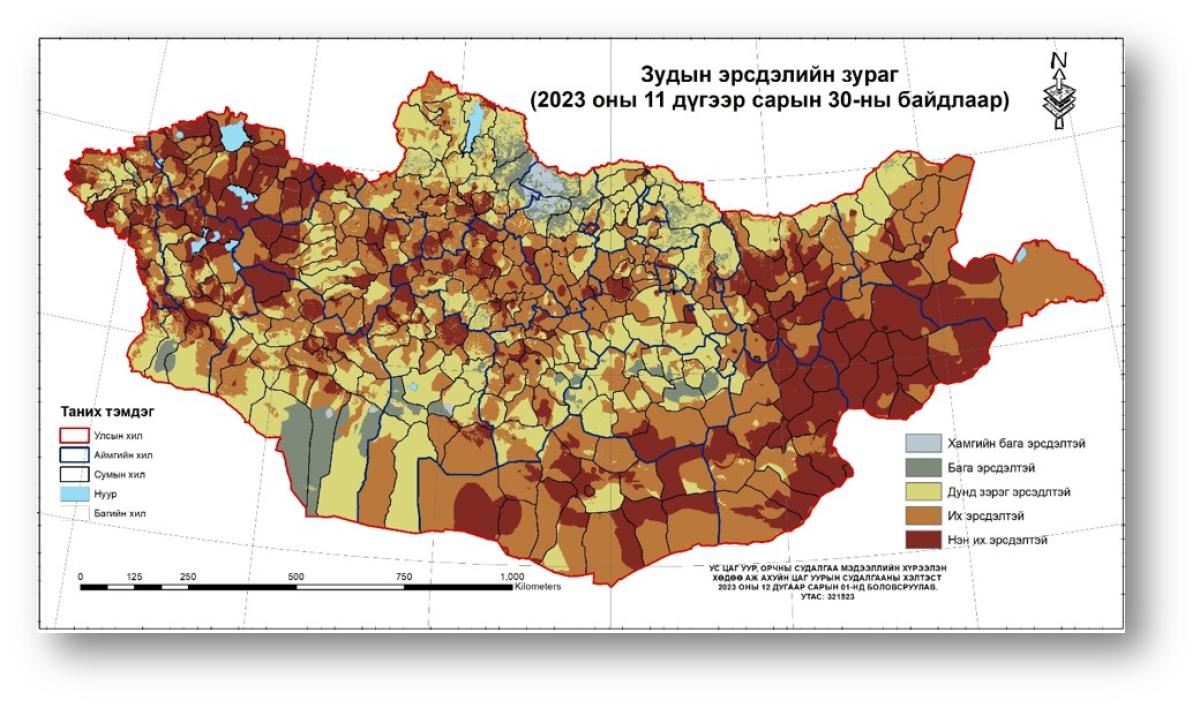 Мөн зудын эрсдэлийн үнэлгээгээр Увс, Сүхбаатар, Хэнтий, Дорноговь аймгийн ихэнх, Архангай, Баян-Өлгий, Говь-Алтай, Дорнод, Завхан, Өмнөговь, Ховд аймгийн зарим нутгаар нэн их эрсдэлтэй гарлаа.