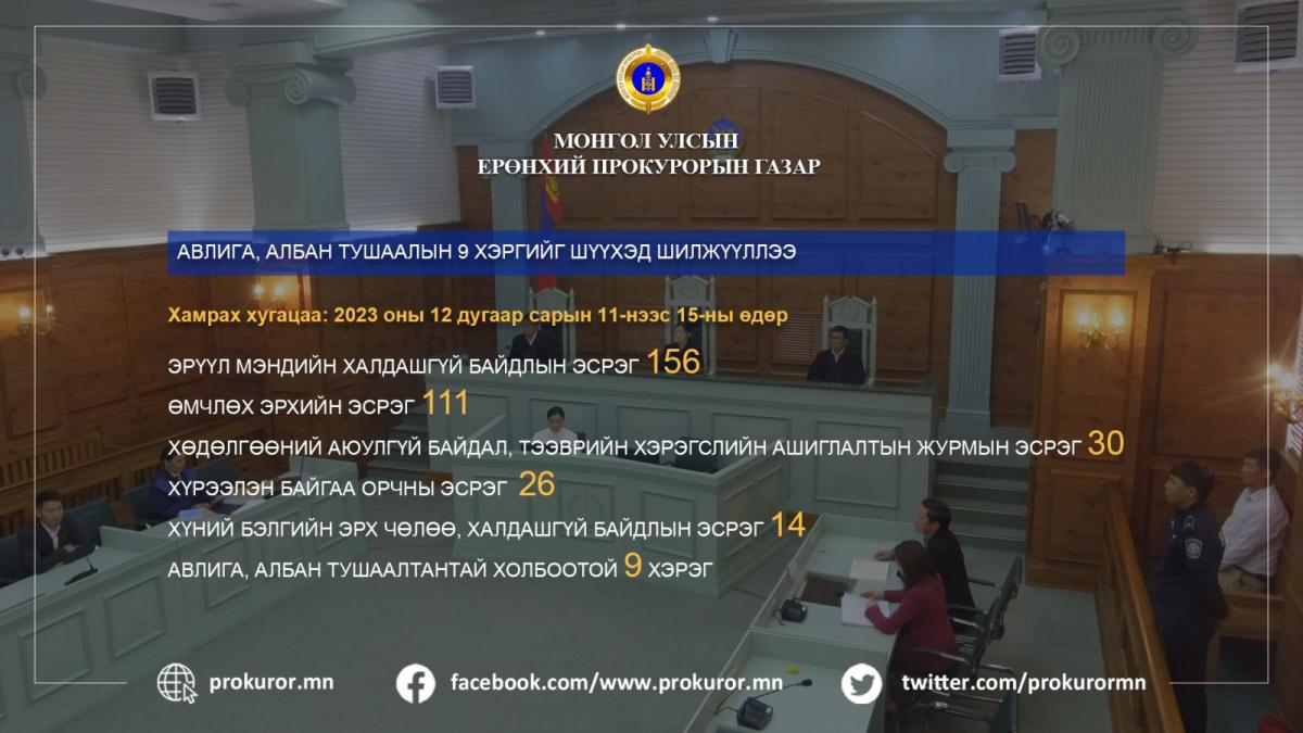 Прокурорын байгууллага 2023 оны арванхоёрдугаар сарын 11-нээс 15-ны өдрүүдэд 361 хэрэгт яллах дүгнэлт үйлдэн шүүхэд шилжүүлж шийдвэрлэлээ.
