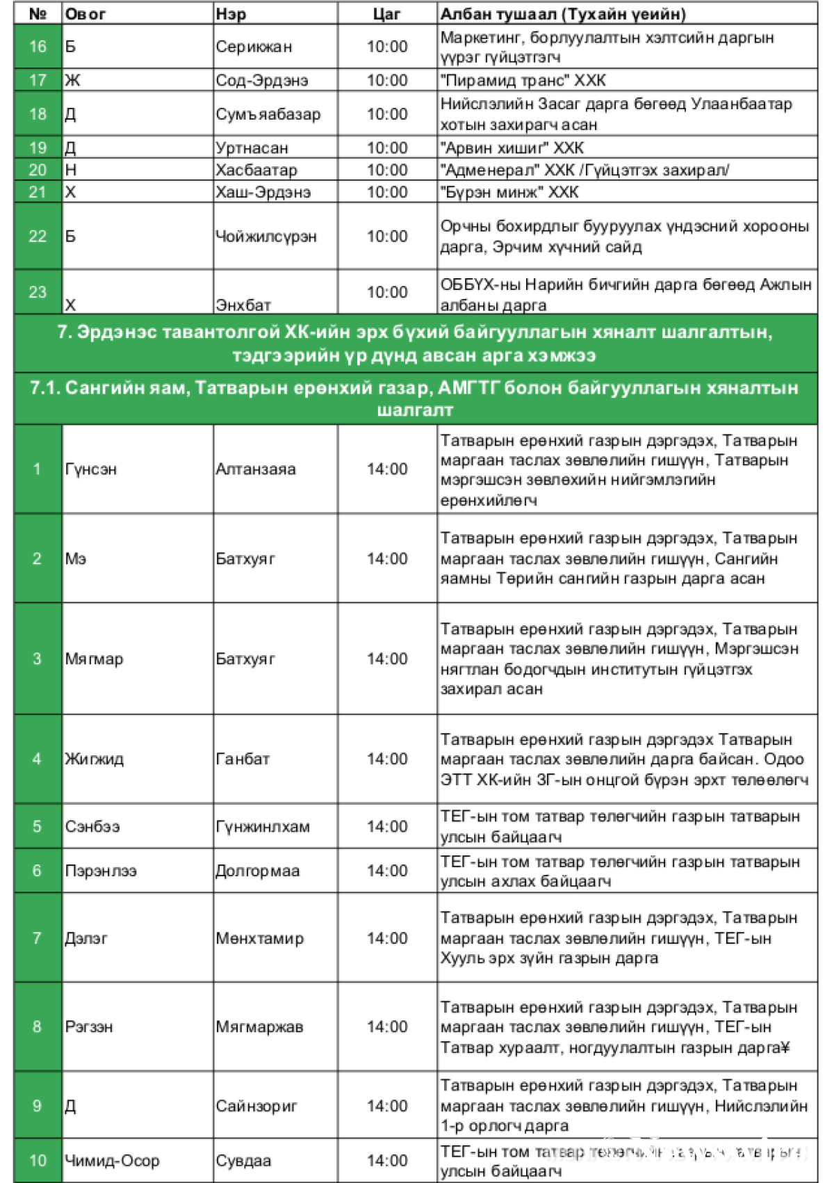 1) Сангийн яам, Татварын ерөнхий газар, АМГТГ болон байгууллагын хяналтын шалгалт