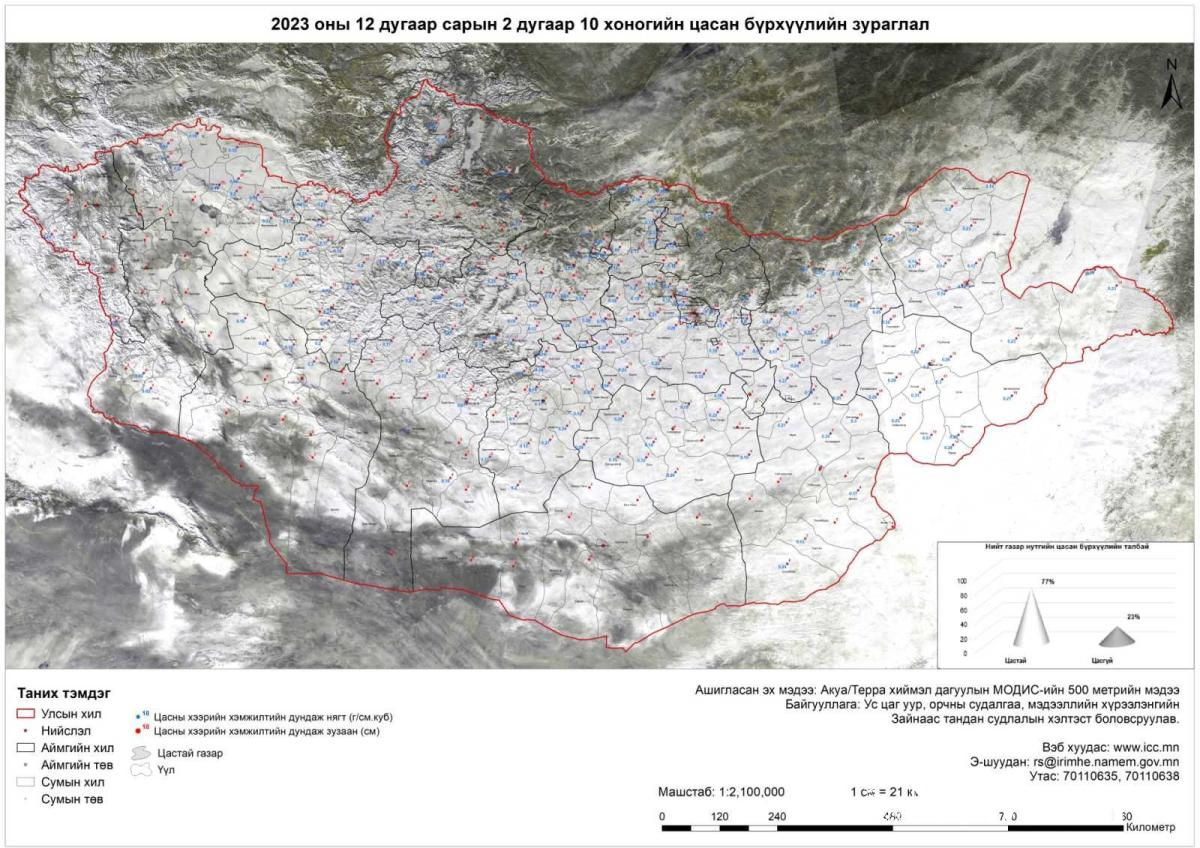 Ус цаг уур, орчны судалгаа мэдээллийн хүрээлэнгээс арав хоногт нэг удаа хийдэг хээрийн цасны хэмжилтийн мэдээгээр арванхоёрдугаар сарын 20-ны байдлаар нийт нутгийн 80 гаруй хувьд цастай байна.