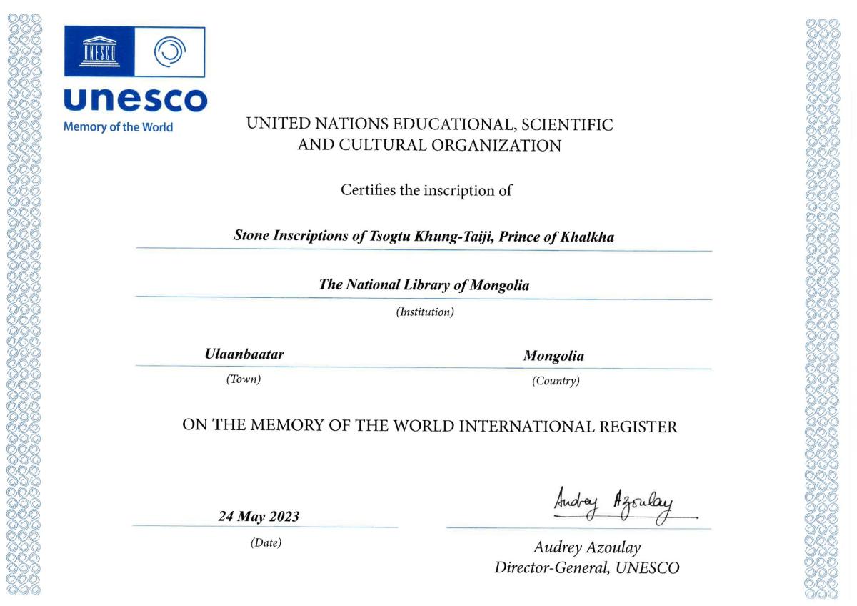 ЮНЕСКО-ийн Баримтат өвийн олон улсын жагсаалтад өнөөдрийн байдлаар нийт 430 баримтат өв бүртгэгдээд байна. Үүнээс 5 баримтат өв манай улсаас бүртгэгдсэн бөгөөд 2011 онд Лувсанданзаны "Алтан товч", "Монгол шунхан Данжуур", 2017 онд "Есөн эрдэнийн Ганжуур" бүртгэгдээд байсан бол ийнхүү “Халхын Цогт хунтайжийн хадны бичээс” бүртгэгдлээ.