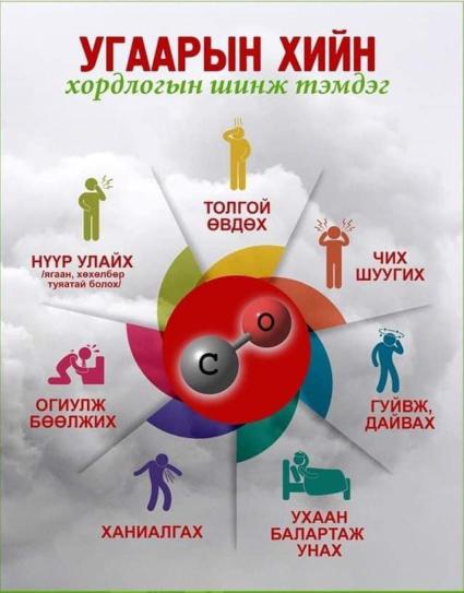 Угаарын хийд хөнгөн хордоход чих шуугих, толгой өвдөх булчин бие сулрах, дотор эвгүй оргих, биеийн тэнцвэр алдагдах, толгой өвдөн дүүнгэ юм шиг болдог.