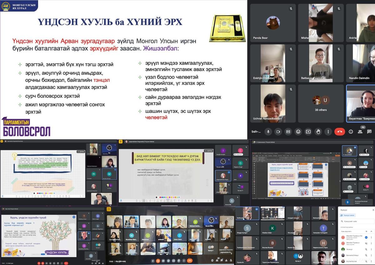 Нийт найман удаагийн цахим хичээлийг “Парламентын боловсрол” хөтөлбөрийн сургагч багш нар удирдан явуулсан бөгөөд нэг удаагийн хичээл 60 минутын хугацаанд үргэлжилсэн. “Монгол Улсын Үндсэн хууль” сэдэвт цахим хичээлийн агуулгыг “Парламентын боловсрол” хөтөлбөрийн гарын авлагын хүрээнд боловсруулж, “Үндсэн хууль гэж юу вэ?”, “Яагаад хүний эрх, эрх чөлөөг Үндсэн хуулиар баталгаажуулдаг вэ?” зэрэг асуултын хүрээнд сурагчдын дунд хэлэлцүүлэг өрнүүлж, оролцооны аргад тулгуурлан Үндсэн хуулийн ач холбогдлын талаар ойлголт, мэдээлэл өглөө.