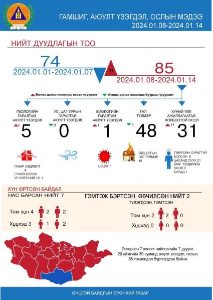 Улсын хэмжээнд өнгөрсөн долоо хоногт нийслэлийн 7 дүүрэг, 20 аймгийн 39 суманд аюулт үзэгдэл, ослын 85 удаагийн дуудлага бүртгэгдлээ. Дуудлагын дагуу төв, орон нутгийн Онцгой байдлын байгууллагын алба хаагчид үүрэг гүйцэтгэн, 22 хүний амь насыг авран хамгааллаа.