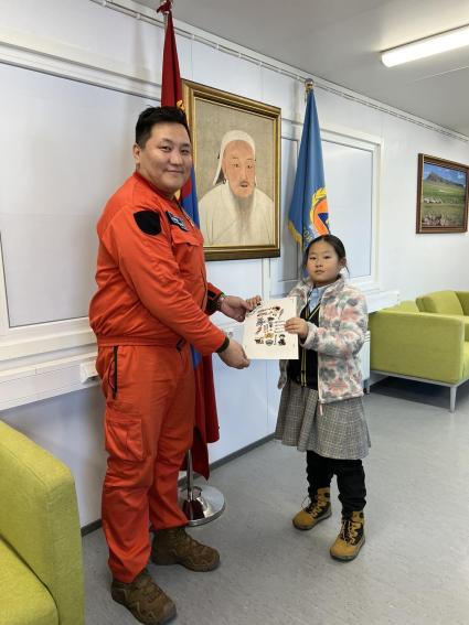Тэрээр ээж, ахын хамтаар Агаараас эрэн хайх, аврах 111 дүгээр ангид хүрэлцэн ирж, нислэгийн экипажийн бүрэлдэхүүнд чин сэтгэлийн талархлаа илэрхийлж, ангийн үйл ажиллагаатай танилцлаа.