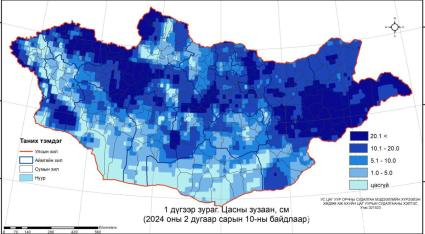 Цаг уурын байгууллагаас арав хоногт нэг удаа хийдэг хээрийн цасны хэмжилтийн мэдээгээр энэ сарын 10-ны байдлаар нийт нутгийн 80 гаруй хувьд цасан бүрхүүлтэй байна.