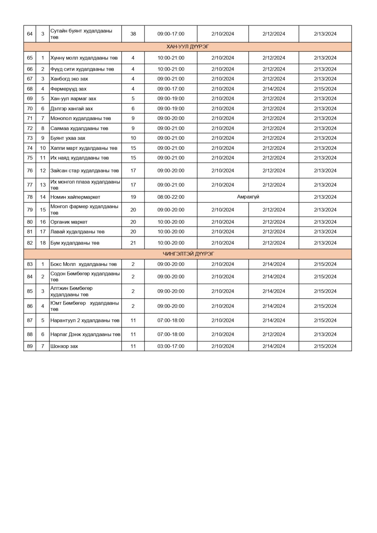 Харин нийслэлийн зургаан дүүрэгт 41 зах, худалдааны төв амарч байна. Тодруулбал Бөмбөгөр, Шонхор, Бэлх, Дүнжингарав, Барс худалдааны төв энэ сарын 15-наас ажиллах бол Нарантуул олон улсын худалдааны төв 21-нээс ажиллана.