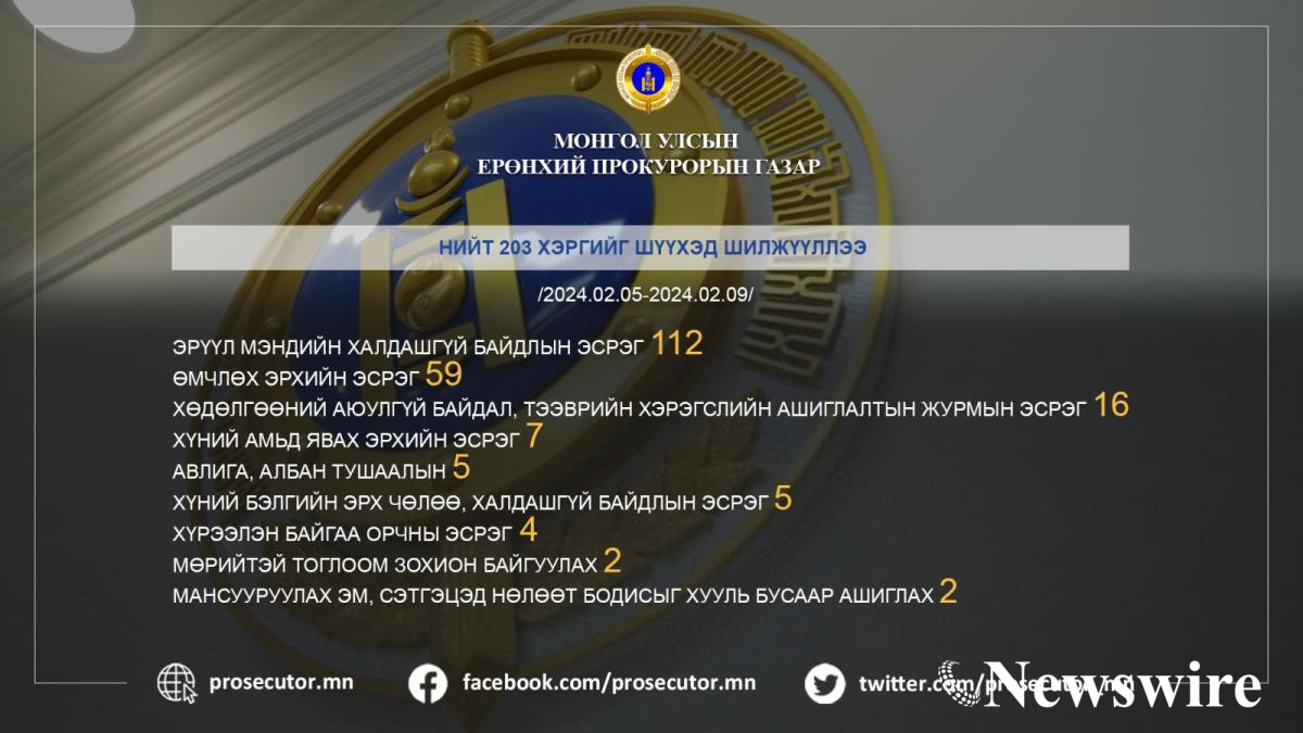 Прокурорын байгууллага 2024 оны хоёрдугаар сарын 05-наас 09-ний өдрүүдэд 203 хэрэгт яллах дүгнэлт үйлдэн шүүхэд шилжүүлж шийдвэрлэлээ.