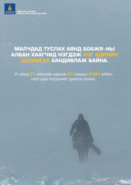 Мөн харьяа 87 газрын 3191 албан хаагчдыг МАЛЧДАД ТУСЛАХ АЯН-д нэгдэхийг уриаллаа. Засгийн газрын шийдвэрээр хаваржилт хүндэрсэн аймгуудад тусламж үзүүлэх Шуурхай бүлгүүдийг байгуулсан, сайд нар ахлан ажиллаж байна. Шуурхай бүлгүүд нь өвс тэжээл, түлш шатахуун, хоол хүнсний тусламж үйлчилгээг үзүүлэхээс гадна хаагдсан зам давааг нээх, зам гаргах зэрэг ажлыг гүйцэтгэж байна.