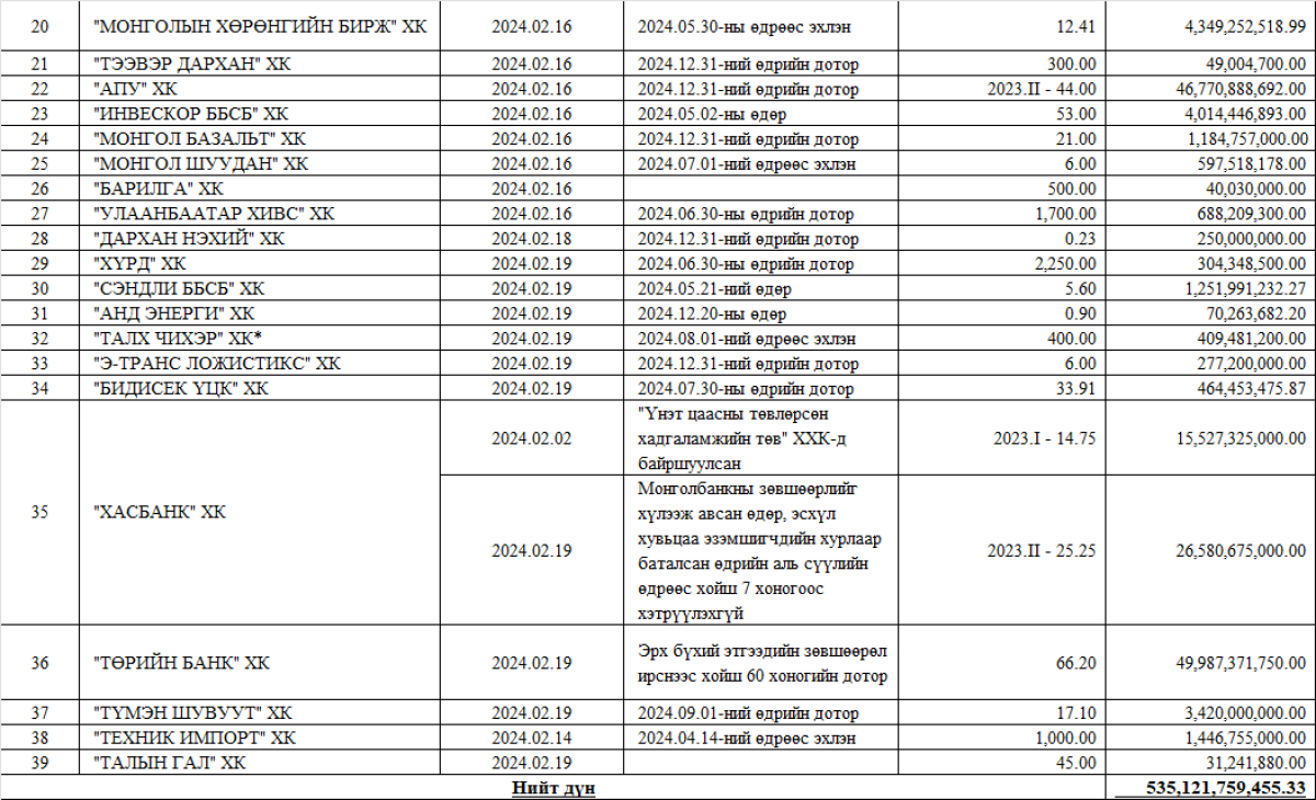 Энэ дагуу өчигдрийн байдлаар 35 компани 480.24. тэрбум төгрөгийн ногдол ашиг хуваарилахаар болсныг Санхүүгийн зохицуулах хорооноос мэдээлсэн. Тэгвэл өнөөдөр /2024.02.21/ нийт 39 хувьцаат компани болж нэмэгдэж, ногдол ашгийн дүн ч 535.1 тэрбум төгрөгөөр мөн нэмэгдээд байна.