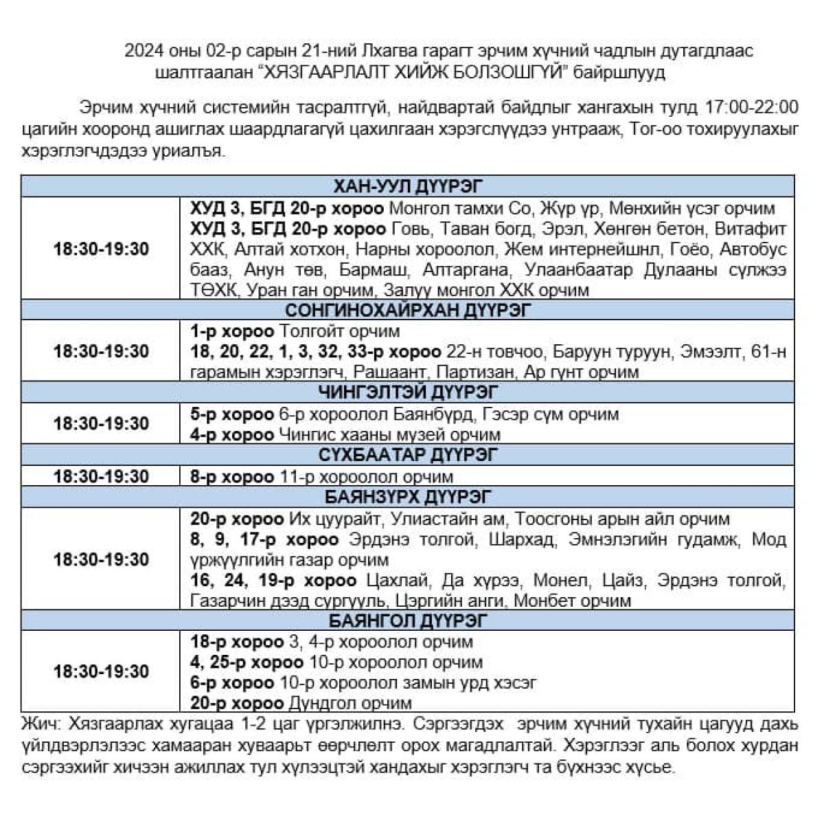 Жич: Хязгаарлах хугацаа 1-2 цаг үргэлжилнэ. Сэргээгдэх эрчим хүчний тухайн цагууд дахь үйлдвэрлэлээс хамааран хуваарьт өөрчлөлт орох магадлалтай. Хэрэглээг аль болох хурдан сэргээхийг хичээн ажиллах тул хүлээцтэй хандахыг хэрэглэгч та бүхнээс хүсье.