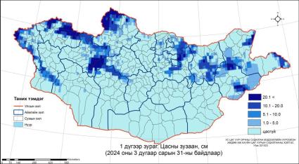 Алтай, Хангай, Хэнтий, Хөвсгөлийн уулархаг нутаг, Увс нуур, Дархадын хотгор, Хан Хөхийн нуруу, Дарьгангын тэгш өндөрлөг, Монголын Дорнод талаар 10-32 см, бусад нутагт 1-9 см, хунгарлаж шуурсан газартаа 40 см хүртэл зузаан цастай байгаа юм.