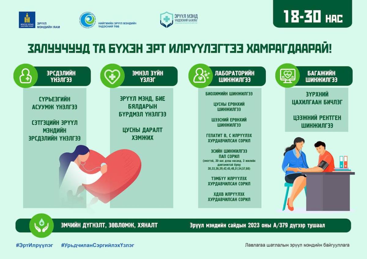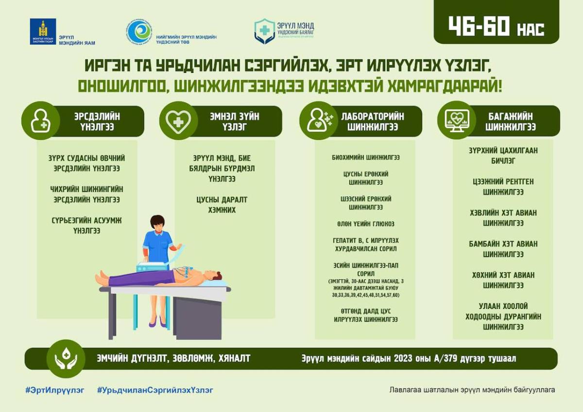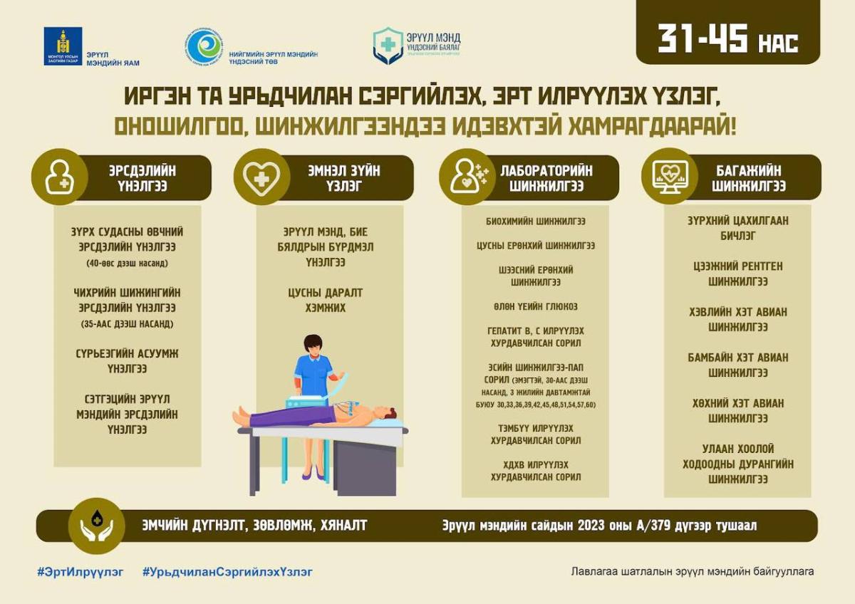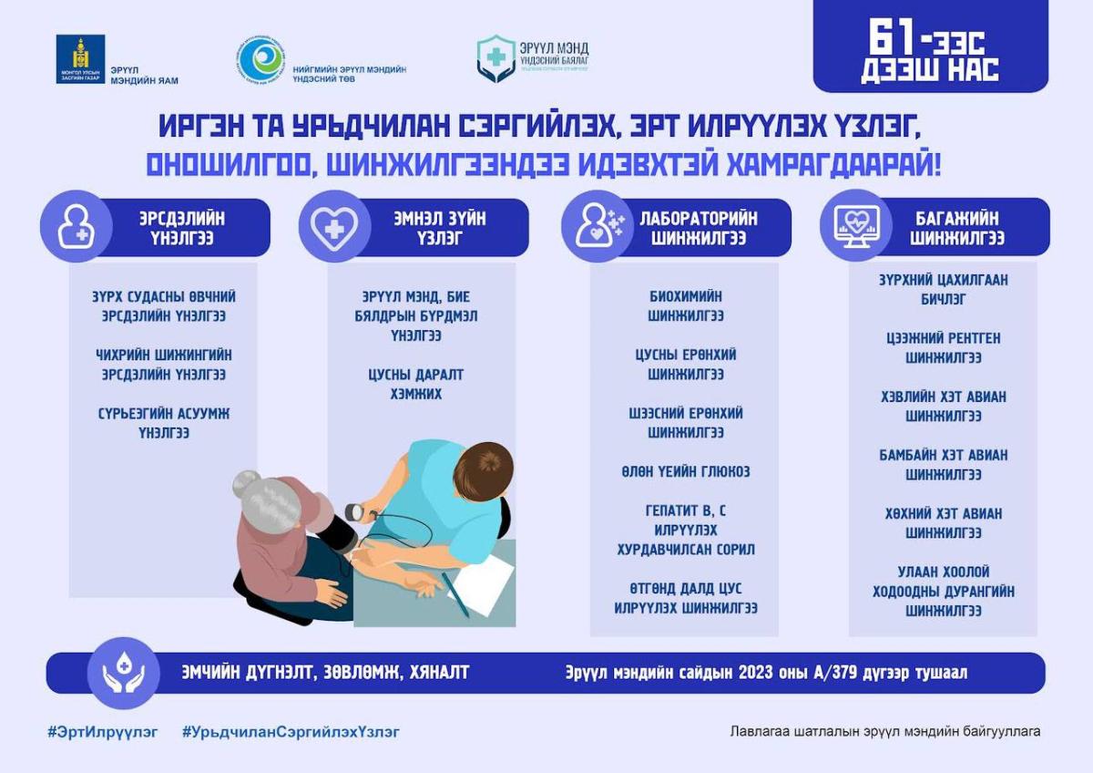 Эрүүл мэндийн даатгалаа бүрэн төлсөн даатгуулагч та урьдчилан сэргийлэх, эрт илрүүлгийн багцад багтсан бүх үзлэг, оношилгоо, шинжилгээнд бүрэн хамрагдах боломжтой.