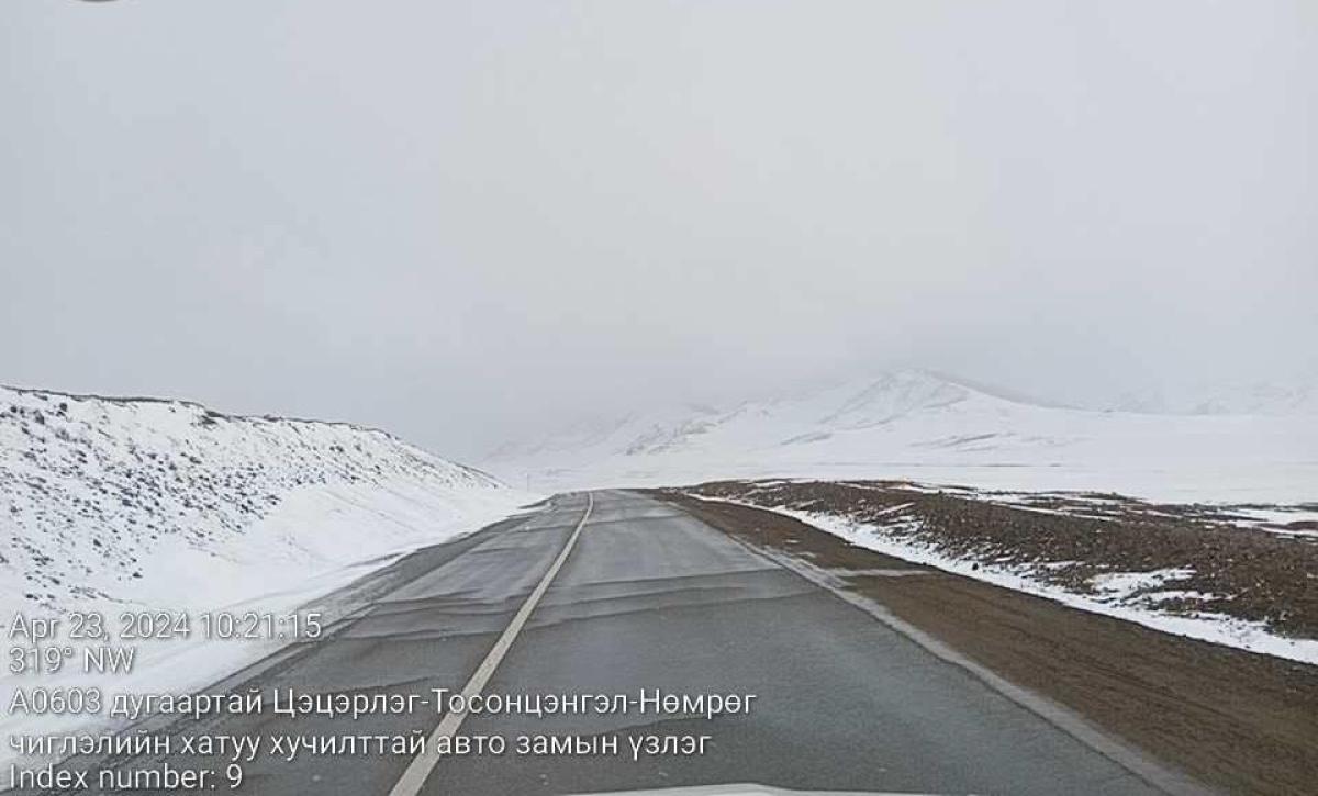 А0603 дугаартай Цэцэрлэг-Тосонцэнгэл-Нөмрөг чиглэлийн Солонготын даваанд цас орж, шуургатай байна.