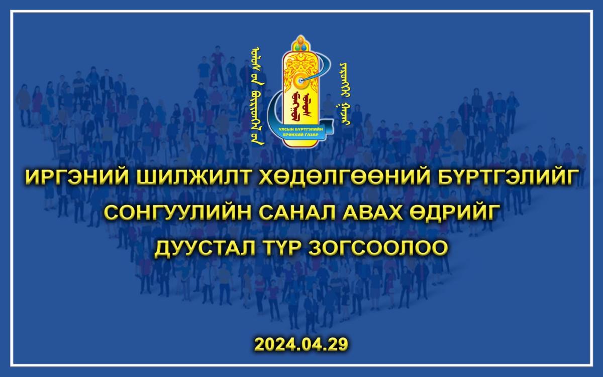 УИХ-ын сонгуулийн тухай хуулийн 25 дугаар зүйлд заасны дагуу иргэний шилжилт хөдөлгөөний бүртгэлийг сонгуулийн санал авах өдрөөс 60 хоногийн өмнө зогсооно гэсний дагуу өнөөдрөөс буюу 2024 оны дөрөвдүгээр сарын 29-ний өдрөөс түр зогсоолоо.