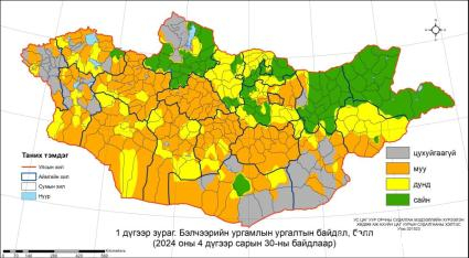 Бэлчээрийн ургамлын ургалтын байдал дөрөвдүгээр сарын 30-ны байдлаар нийт нутгийн 10 орчим хувьд цухуйгаагүй. Архангай, Улаанбаатар, Дундговийн нийт, Увс, Говь-Алтай, Завхан, Баянхонгор, Өвөрхангайн ихэнх, Баян-Өлгий, Ховд, Төв, Өмнөговь, Дорноговь, Сүхбаатарын зарим сумдын нутгаар муу буюу ургамал цухуйсан боловч мал идэх боломжгүй. Дорнодын нийт, Хөвсгөл, Дархан-Уул, Хэнтийн ихэнх, Увс, Булган, Сэлэнгэ, Төв, Өмнөговийн цөөн сумдын нутгаар хэвийн, бусад нутгаар дунд байна.
