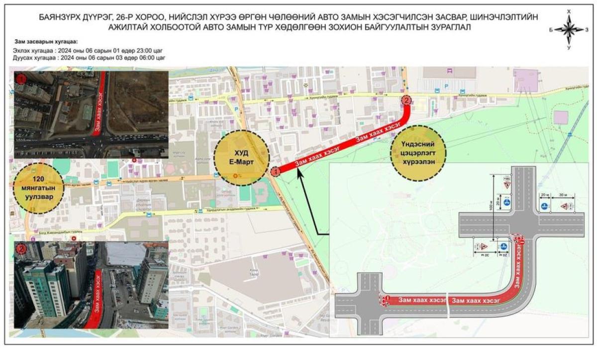 Баянзүрх дүүргийн 26 дугаар хороо, Дүнжингарав худалдааны төвийн уулзвараас И-Март худалдааны төвийн уулзвар хүртэлх замын урд болон хойд талыг зургаадугаар сарын 1-ний 23:00 цагаас 3-ны өдрийн 06:00 цагийн хооронд хааж, шинэчилнэ.