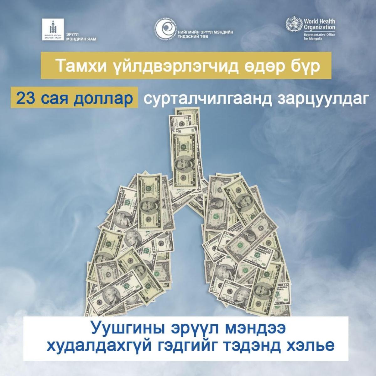 Монгол улсад жил бүр 4300 орчим хүн тамхины улмаас нас бардаг бөгөөд тамхины хэрэглээнээс болж амь насаа алдсан хүмүүсийн 72% нь 70 наснаас өмнө тохиолдож болох нас баралтын 17%-ийг эзэлж байна.