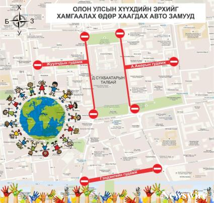 Хүүхдийн эрхийг хамгаалах өдөр Нийслэлийн засаг даргын 2024 оны 05 дугаар сарын 30-ны өдрийн А/613 дугаар захирамжийн дагуу Жанжин Д.Сүхбаатарын талбай орчмын замын хөдөлгөөнийг хаана. Тодруулбал, 2024 оны 06 дугаар сарын 01-ний өдрийн 08:00 цагаас 20:00 цагийн хооронд түр хязгаарлах юм.