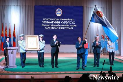 • “Иргэдэд учирч болзошгүй осол, гамшгийн аюулаас урьдчилан сэргийлэх, авран хамгаалах болон хуулиар хүлээсэн үүргээ амжилттай биелүүлж бүс, орон нутгийн хөгжилд оруулж буй хувь нэмрийг нь үнэлэн Дорнод аймгийн Онцгой байдлын газрыг Монгол Улсын төрийн дээд шагнал “Цэргийн гавьяаны одон”-оор шагнасугай” гэжээ.