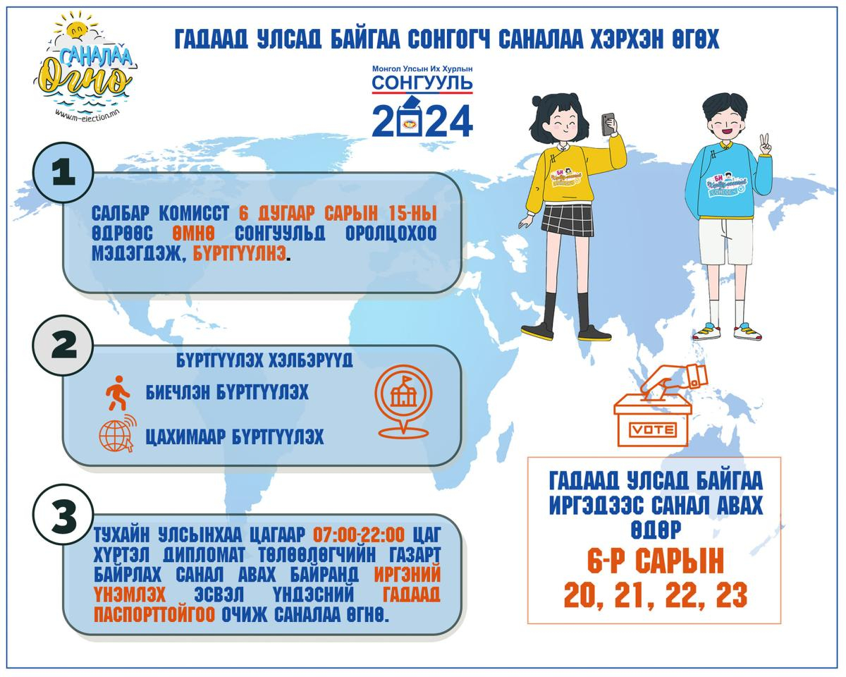 ГАДААД УЛСАД БАЙГАА СОНГОГЧ ТА 2024.06.15-ны өдрөөс өмнө Дипломат төлөөлөгчийн газартаа цахимаар эсхүл биечлэн очиж Монгол Улсын Их Хурлын 2024 оны сонгуульд оролцож санал өгөх хүсэлтээ бүртгүүлээрэй.