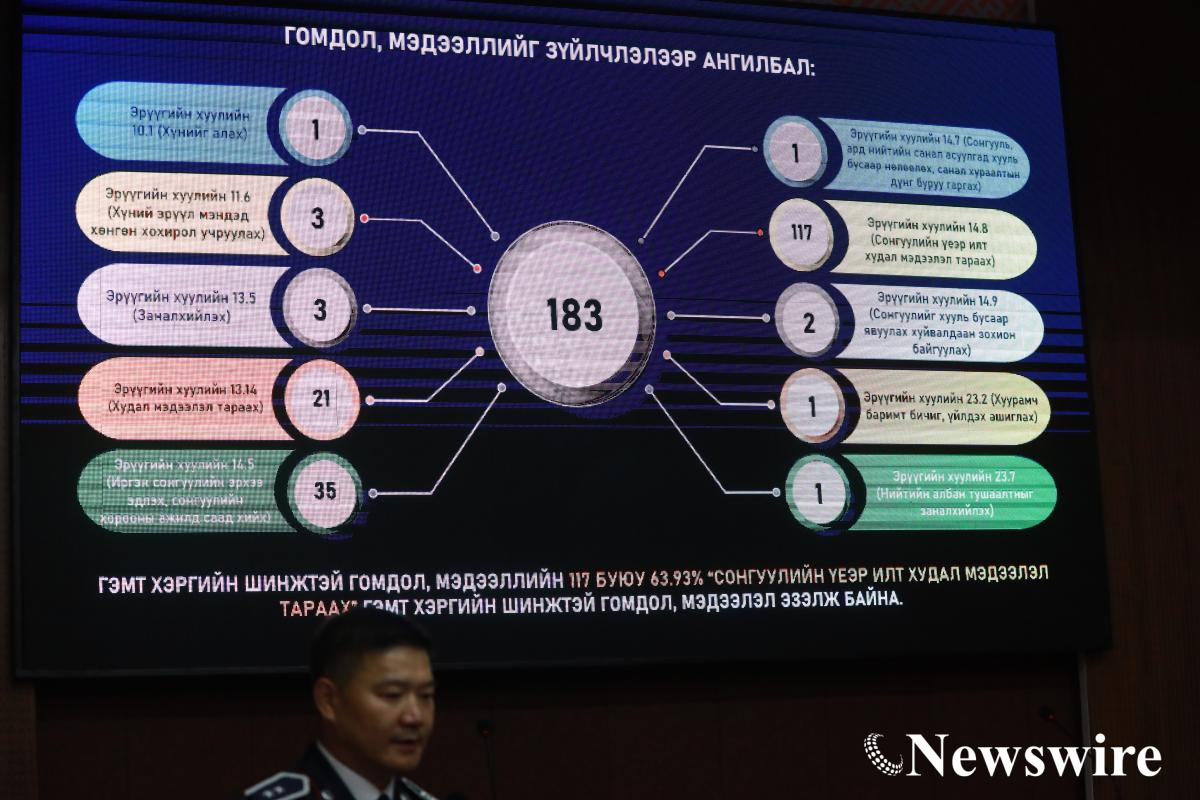 Цагдаагийн байгууллагаас сонгуулийн хууль тогтоомж зөрчсөн асуудлаар бүртгэгдэн шалгагдаж байгаа гэмт хэрэг зөрчлийн талаар мэдээлэл өглөө.