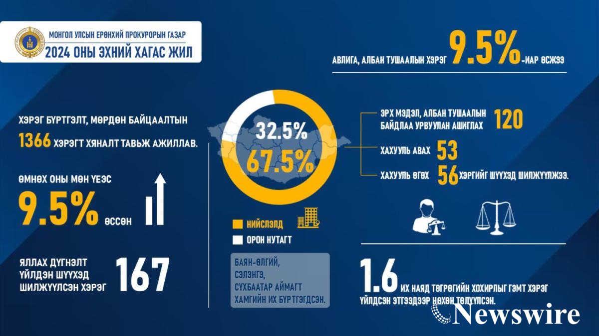 Прокурорын байгууллага энэ оны эхний хагас жилд авлига, албан тушаалын 1366 хэрэг бүртгэлт, мөрдөн байцаалтын хэрэгт хяналт тавьсан бөгөөд өмнөх оны мөн үетэй харьцуулбал 9.5 хувиар өсжээ.