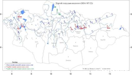 Долоодугаар сарын 22-ны өдрийн байдлаар Хөвсгөлийн уулсаас эхтэй Үүр голын усны түвшин өмнөх өдрийнхөөс 293 см, Хэнтий нурууны баруун хажуугаас усжих Тэрэлж голын усны түвшин 117 см нэмэгдэж, Үүр гол үерийн аюултай түвшинг 105 см, Тэрэлж гол үерийн түвшинг 55 см даван тус тус хүчтэй үерлэж байна.