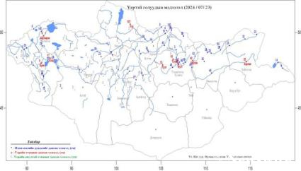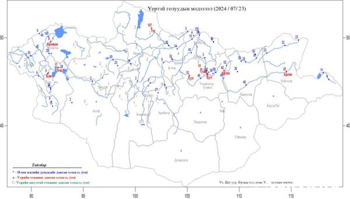 Долоодугаар сарын 23-ны өдрийн байдлаар Хөвсгөлийн уулсаас эхтэй Эг, Бэлтэс, Шишхэд, Хэнтий нурууны баруун хажуугаас усжих Туул, Ерөө зүүн хажуугийн Эг, Хурх, Барх, Онон, Хэрлэн, Хангай нурууны арын Орхон гол Сэлэнгэ мөрний дагууд усны түвшин өмнөх өдрийнхөөс 10-85 см нэмэгдэж, Туул /Босгийн гүүр-Улаанбаатар-Лүн-Заамар/, Хэрлэн /Мөнгөнморьт-Өндөрхаан-Чойбалсан/ гол үерийн түвшинг 10-40 см давсан байдалтай байгаа бол Үүр голын усны түвшин аюул түвшнээс буусан хэдий ч үерийн түвшинг 105 см давсан байдалтай нэлээд элбэг устай байна.