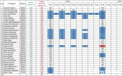 Долоодугаар сарын 25-ны өдрийн байдлаар Сэлэнгэ мөрөн Хялгант тосгон Зүүнбүрэн сум Сүхбаатар хот орчимд усны түвшин өмнөх өдрөөс 40-60, Эг гол Хантай баг орчмоор 120 см тус тус нэмэгдэж, үерийн түвшинд 10-40 см дөхсөн байна.