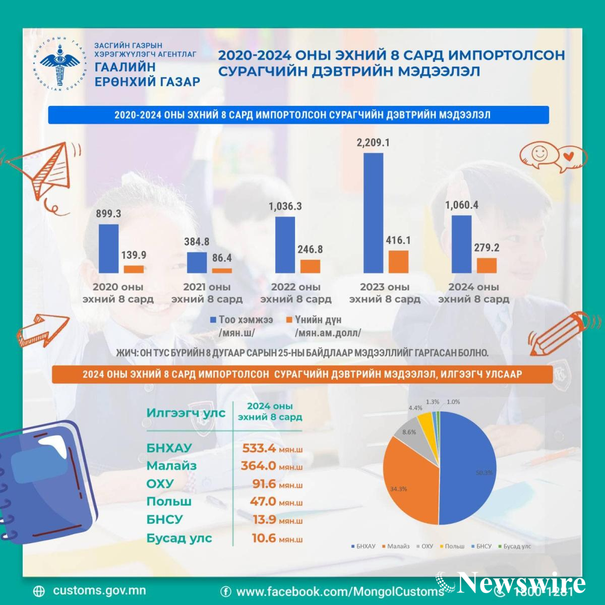 Монгол Улс 2024 оны эхний 8 сард 2.8 сая ам долларын үнийн дүнтэй 10.6 сая ширхэг сурагчийн дэвтэр импортолжээ. Үүний 50.3%-ийг БНХАУ, 34.3%-ийг Малайз улсаас тус тус импортолсон байна.