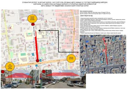 СБД-ийн 16 дугаар хороо, 16 дугаар сургууль орчмын авто замыг 8 дугаар сарын 29-ний өдрийн 07:00 цагаас 9 дүгээр сарын 1-ний өдрийн 05:00 цаг хүртэл хааж, борооны ус зайлуулах шугам хоолой угсарна.
