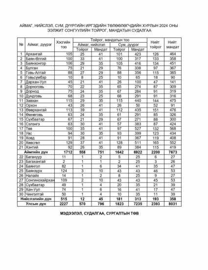 Аймаг, нийслэл, сум, дүүргийн иргэдийн Төлөөлөгчдийн Хурлын 2024 оны ээлжит сонгуулиар 2393 тойрог байгуулж, 8031 мандат тогтоосон. Тодруулбал, 21 аймгийн 558 тойрог 751, сумдын 1642 тойрог 6922, нийслэлийн 12 тойрог 45, дүүргийн 181 тойрог 313 мандаттай юм.