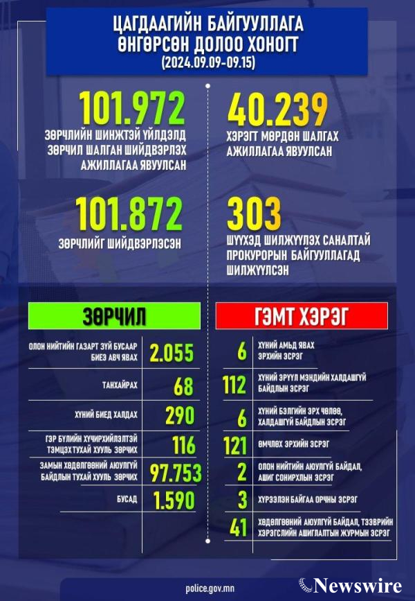 Цагдаагийн байгууллагаас өнгөрсөн долоо хоногт (2024.09.09-өөс 09 дүгээр сарын 15-ны өдрүүдэд) 40.239 хэрэгт мөрдөн шалгах ажиллагаа явуулж, шүүхэд шилжүүлэх саналтай прокурорын байгууллагад 303 хэргийг хүргүүлсэн байна. Үүнээс: