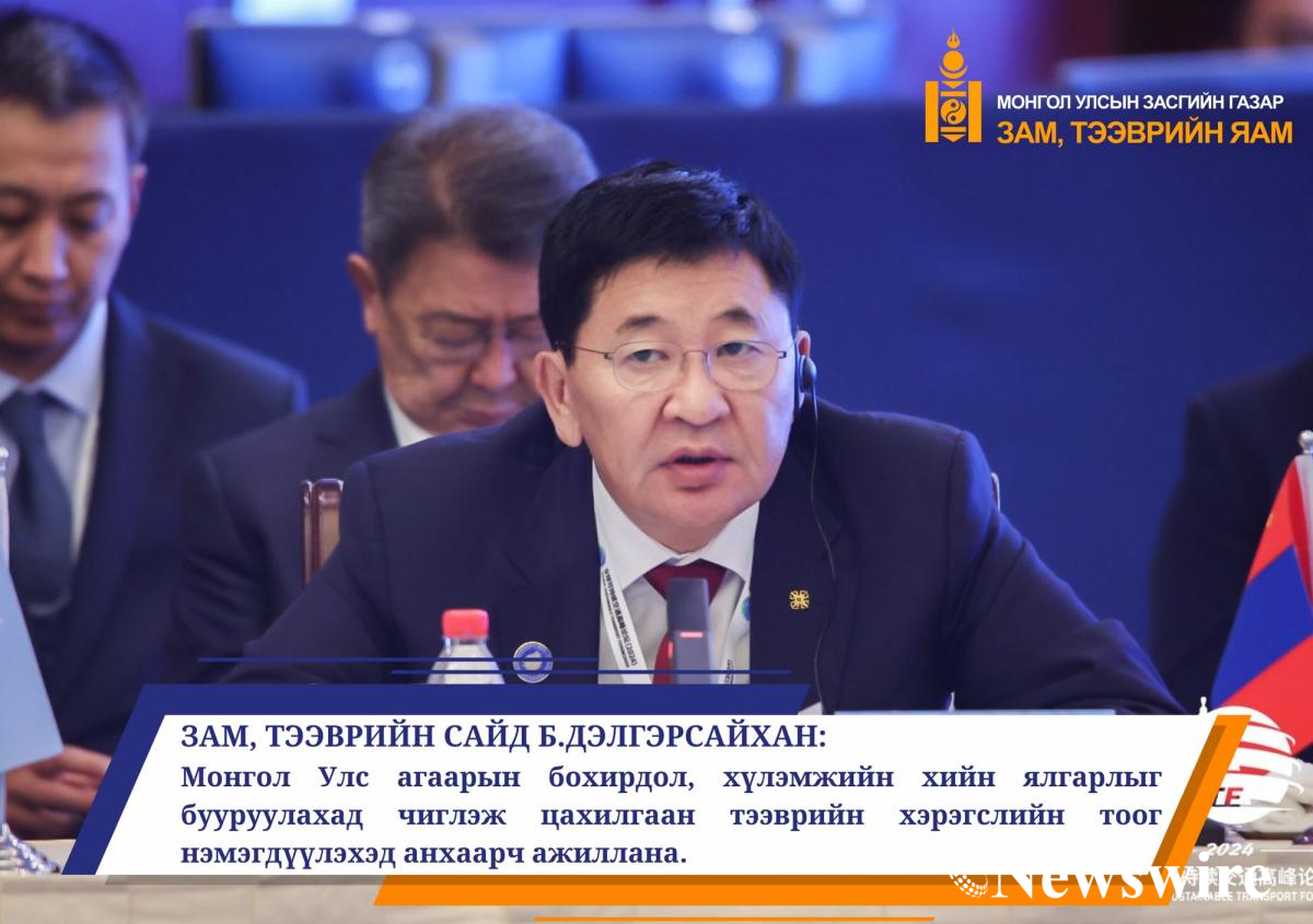 Мөн түүнчлэн Монгол Улсын Засгийн газар үйл ажиллагааны 2024-2028 оны мөрийн хөтөлбөрт тусгагдсан бүс нутгийн интеграцид тодорхой хувь нэмэр оруулахуйц, транзит тээврийн хүчин чадлыг нэмэгдүүлэхэд чиглэсэн Ази–Европыг холбосон авто зам болон төмөр замын коридор, тээвэр, логистикийн төв, хуурай боомтыг байгуулах, хилийн боомтуудын холболт, нэвтрүүлэх хүчин чадлыг сайжруулахад чиглэсэн бүтээн байгуулалтын төслүүдийг хэрэгжүүлэхээр нэн тэргүүний зорилт тавин ажиллаж байгааг дуулгасан юм гэж ЗТЯ-аас мэдээллээ.
