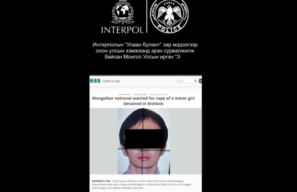 Цагдаагийн байгууллагаас Бүгд Найрамдах Киргиз Улс, Бүгд Найрамдах Казакстан Улсуудын Интерполын Үндэсний төв товчоодтой хамтран ажиллаж Интерполын “Улаан булант” зар мэдээгээр олон улсын хэмжээнд эрэн сурвалжлагдаж байсан Монгол Улсын иргэн “Э”-г Бүгд Найрамдах Киргиз Улсаас энэ оны 10 дугаар сарын 01-нд Монгол Улсад шилжүүлэн авчирлаа.