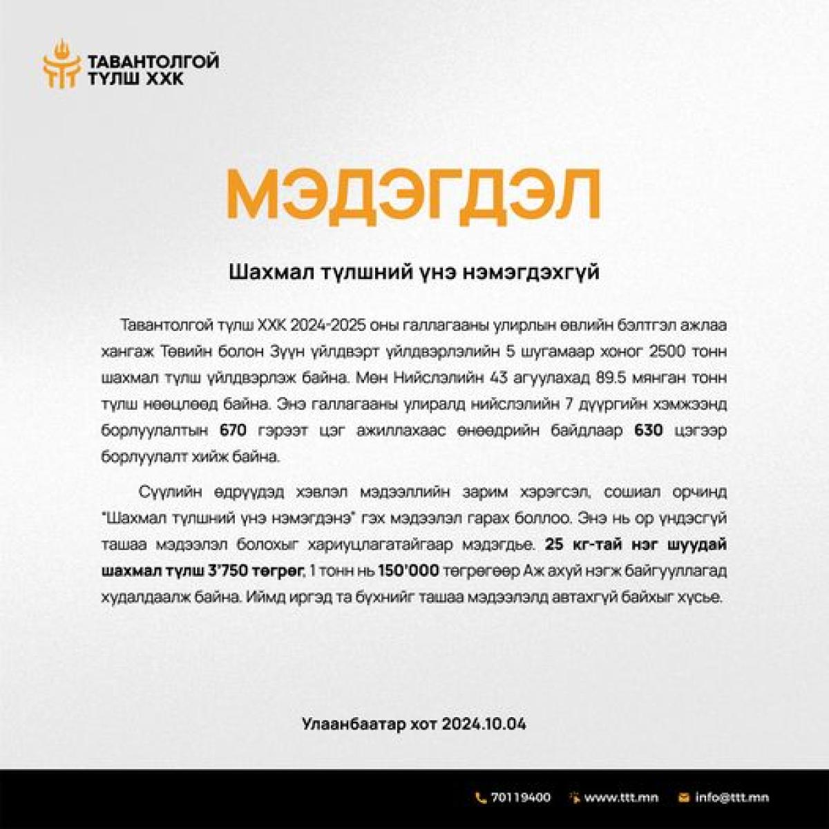 #Шахмал түлш, #Тавантолгой түлш ХХК, #Шахмал түлшний үнэ,