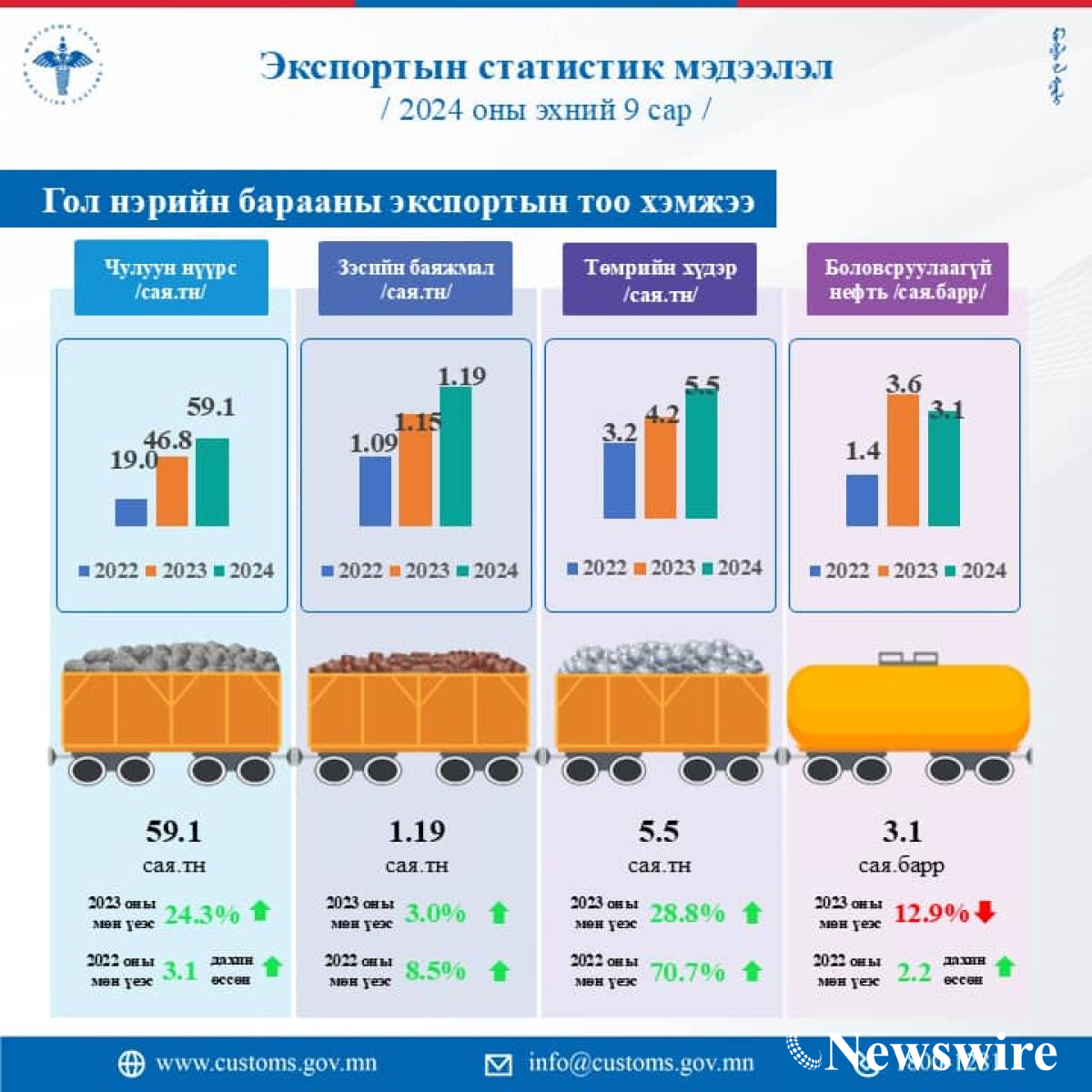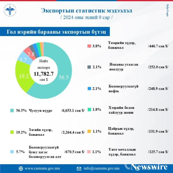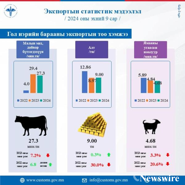 ЭКСПОРТЫН 2024 ОНЫ ЭХНИЙ 9 САРЫН СТАТИСТИК МЭДЭЭг танилцуулж байна.